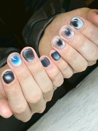 光の角度で表情が変わる、ダークグレー×ブルーのマグネットネイル。