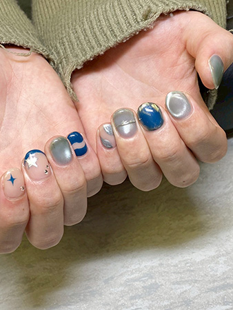シルバー×ブルーのミックスデザイン。スターモチーフが差し色になった、遊び心のある一例です。